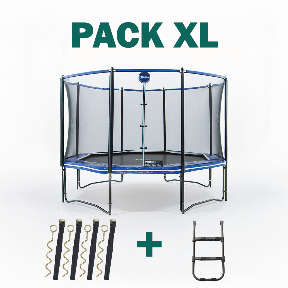 Pack de cama elástica Octopulse 390 con red de seguridad, escalera + kit de anclaje. Ideal para saltos más dinámicos.
