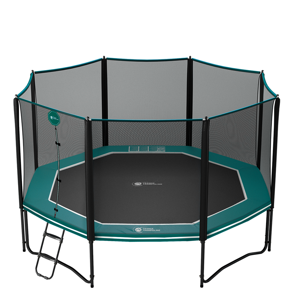 Entregada con red de seguridad, la cama elástica octagonal y familiar Octopulse 460 se distingue por su tamaño XXL que proporciona saltos más dinámicos.  Soporta hasta 120 kg y está diseñada particularmente para adultos y adolescentes que buscan sensaciones fuertes y espacio.
