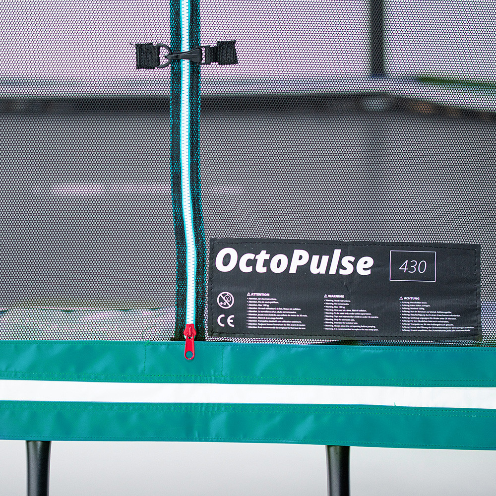 - La red de protección PRÉMIUM de la cama de salto Octopulse 460 posee una entrada con cremallera, la parte superior está reforzada por varillas en fibra de vidrio que hacen que la estructura sea más sólida.