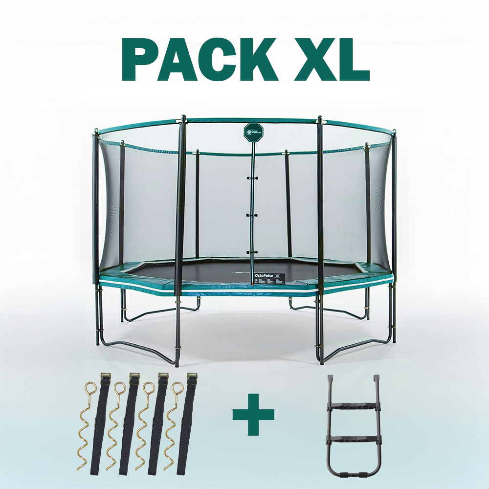 Pack de cama elástica Octopulse 390 con red de seguridad, escalera + kit de anclaje. Ideal para saltos más dinámicos.