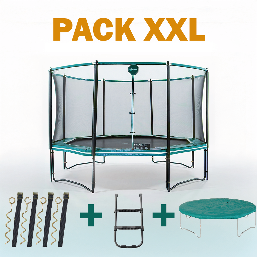 Pack de cama elástica Octopulse 390 con red de seguridad, escalera + funda protectora + kit de anclaje. ¡Ideal para saltos más dinámicos!