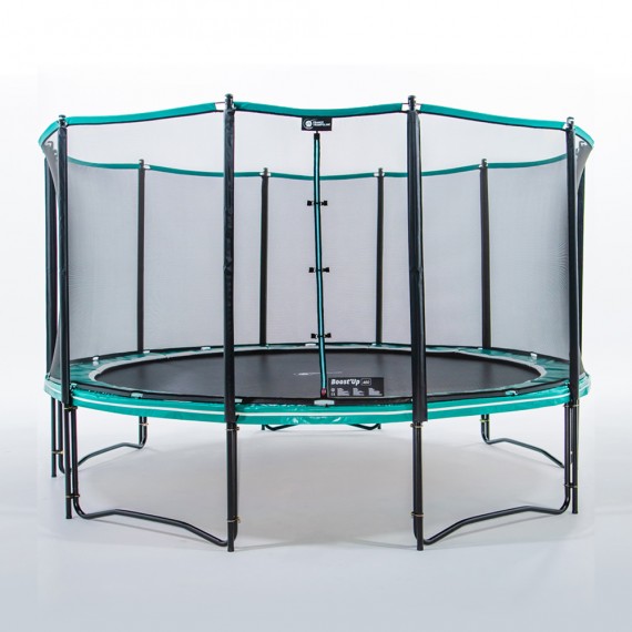 - La red de seguridad Prémium de la Boost’Up 430 se sostiene por 8 postes que llegan hasta el suelo, para lograr una estabilidad máxima. La red de seguridad se mantiene tensa gracias a sus varillas en fibra de vidrio situadas en la parte superior e inferior de la red. El acceso a la cama de salto es seguro, gracias a una puerta con cremallera.