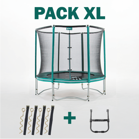 Este Paquete XL Jump’Up 250, con red de seguridad, escalera y kit de anclaje, tiene todo para comenzar con una cama elástica en completa seguridad.