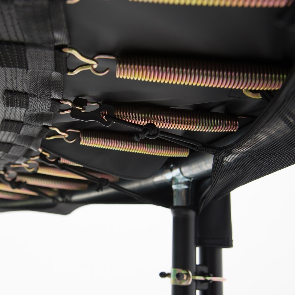 - La tela de salto de más de 10m², reforzada con 8 rangos de costura y una banda de refuerzo, ofrece una buena superficie de salto a los adolescentes y los adultos. Está compuesta de Mesh negro tratado contra los rayos UVA, ofreciendo una gran resistencia a la elongación como al desgarre.