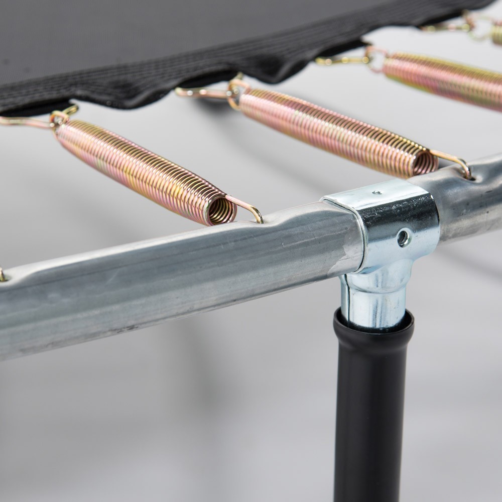 - La estructura de la cama elástica muy sólida y resistente a la corrosión está constituida de tubos de acero galvanizado de 38 mm de diámetro por 2 mm de espesor, de color negro. Los pies y los arcos de la cama elástica están unidos por piezas en T, más sólidas que las simples soldaduras.
