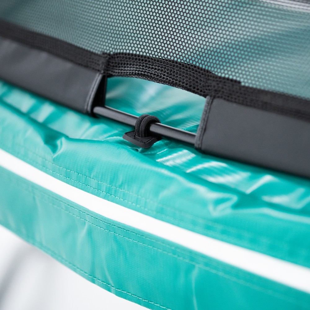 - Red suave y resistente tensa gracias a arcos en fibra de vidrio situados en su parte superior. Compuesto de finas mallas de poliéster, permite evitar cualquier mala caída por fuera de la cama elástica. Hemos preferido colocar un sistema de fijación bajo la cama elástica, para poder dejar cerrado el espacio entre el cojín de protección y la red: así que ningún riesgo de que un usuario se pueda pillar un pie en este sitio. La entrada en la cama elástica se realiza gracias a una puerta, que se abre con una banda de velcro y mosquetones.