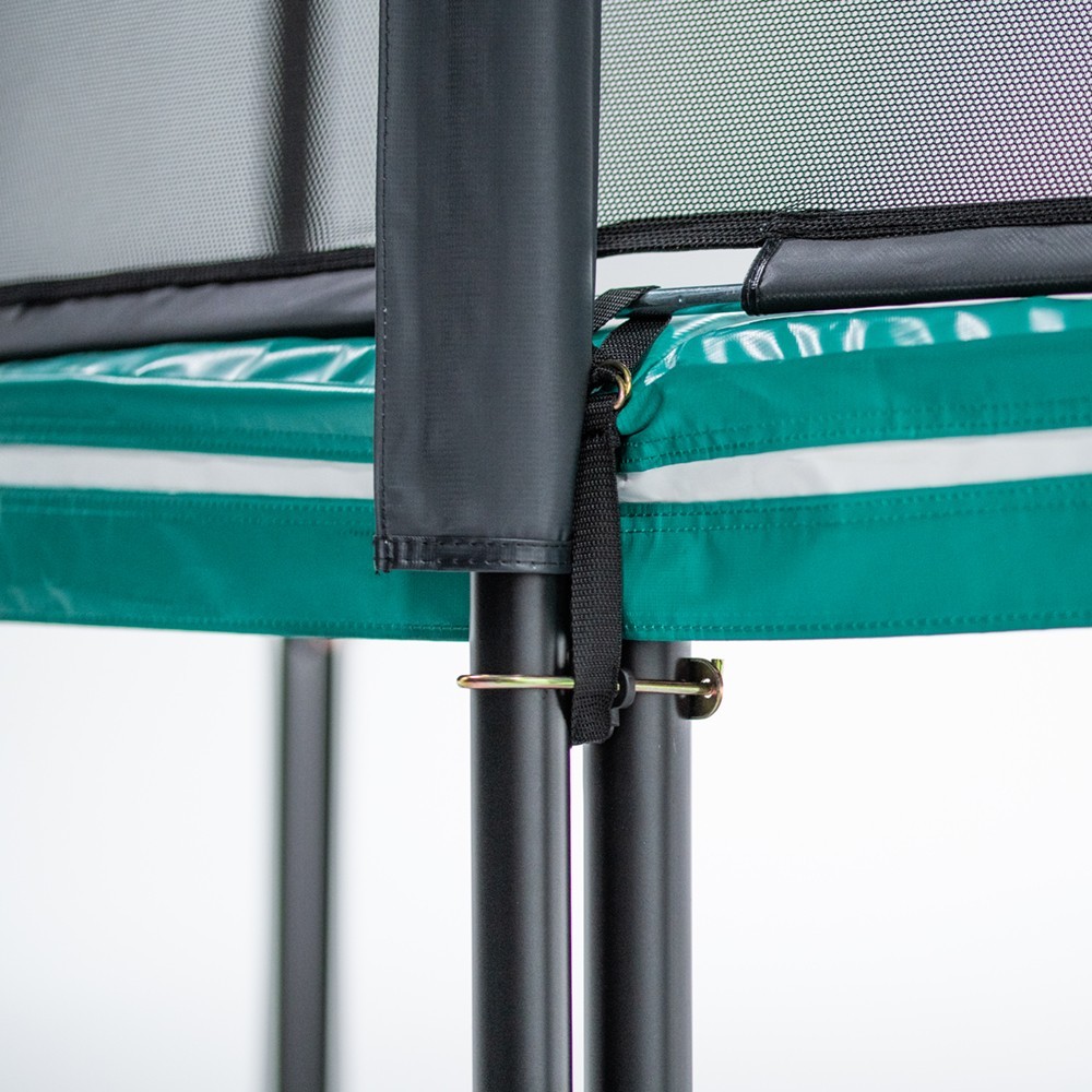 - Solidez & estabilidad garantizadas gracias a sus 10 postes de sujeción de 2,69 m que se apoyan directamente en el suelo (y no sobre los pies de la cama elástica). Cada uno de ellos está compuesto de acero galvanizado de 1,5 mm de espesor resistente a la corrosión, por 38 mm de diámetro: se trata de postes entre los más espesos del mercado.