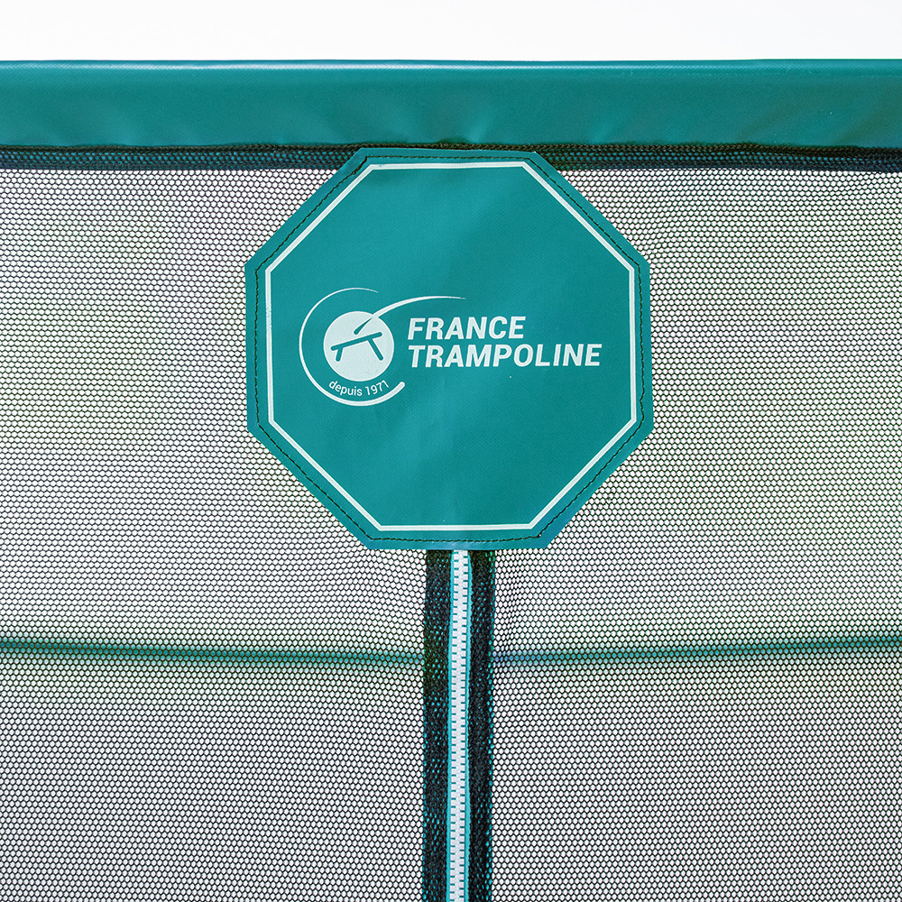 - La red está fabricada en poliéster, un material más robusto y más agradable que el polietileno utilizado masivamente en las camas elásticas baratas. Sus mallas son muy estrechas y no permiten que un niño pequeño pueda pasar un dedo por en medio. La red está tratada contra los rayos UVA  para asegurar una larga duración durante varios años.