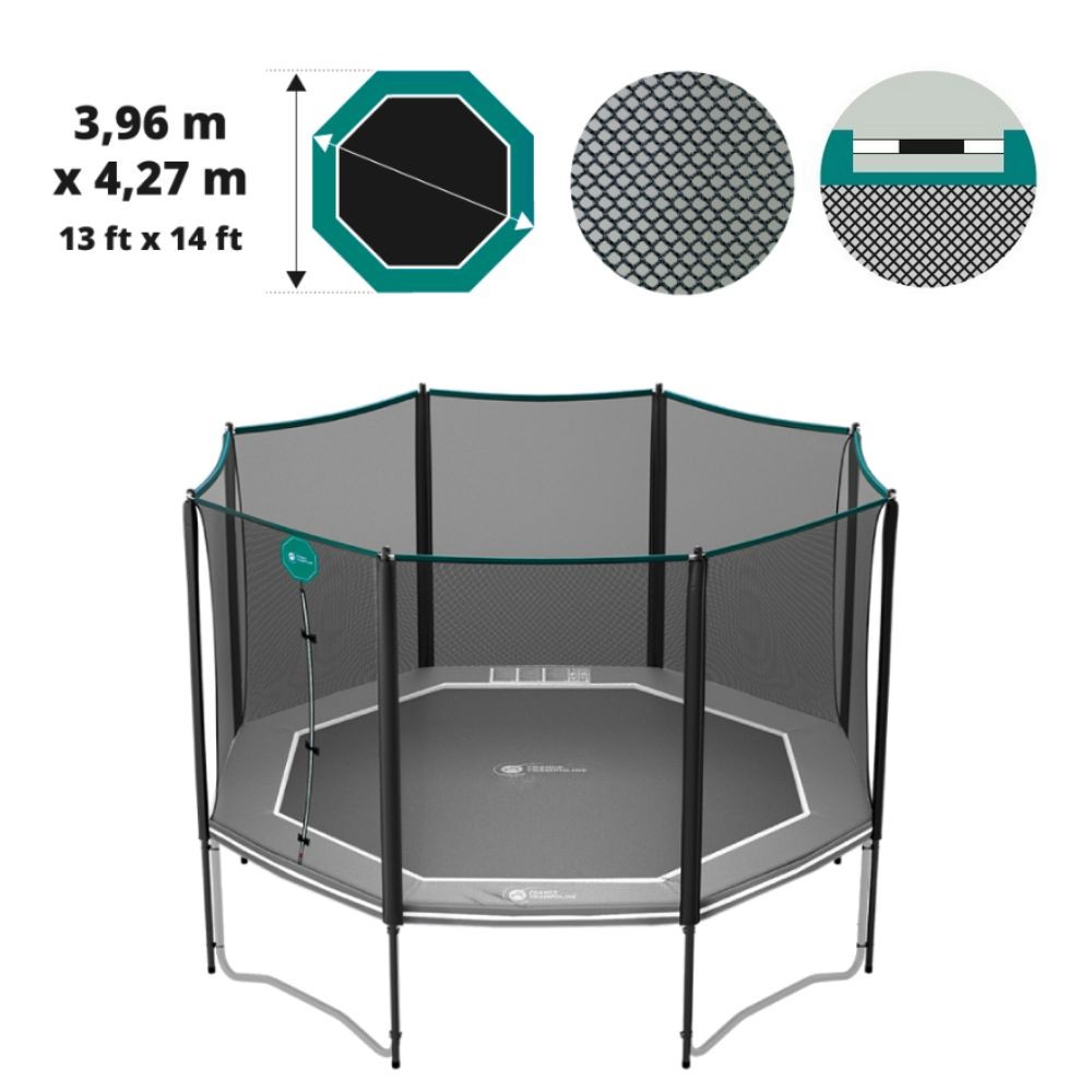 Una red de protección asegura la seguridad en vuestra cama elástica, ya que evita poder caerse por fuera del cojín de protección. Los postes de vuestra cama elástica están en buen estado, pero el tamaño de la malla de la red ha terminado por abrirse tras varios años de utilización. Vuestra cama elástica octogonal de 4,30 m debe estar asegurado de forma rápida para que vuestra familia pueda utilizar la cama elástica con 8 postes verticales que ocupa vuestro jardín.