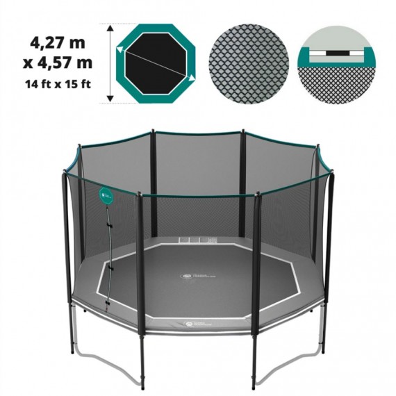 - aunque también es compatible con camas elásticas octogonales de otras marcas que tengan las mismas dimensiones. El diámetro de la cama elástica debe ser de 4,57 m x 4,27 m y poseer 4 pies y 8 postes para mantener la red de protección.